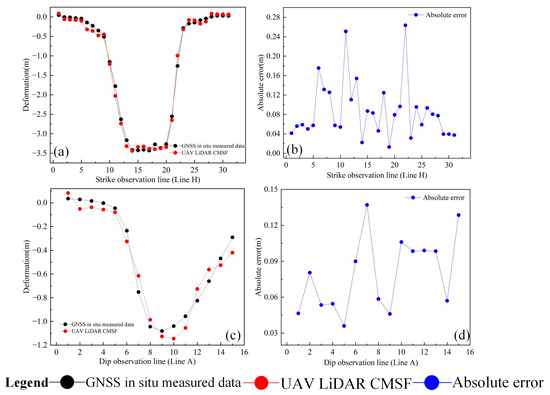 (a,c) The deformation comparison of the UAV LiDAR CMSF and GNSS in situ measured data in Line H and Line A, respectively. (b,d) The error between UAV LiDAR CMSF and GNSS in situ measured data in Line H and Line A, respectively.