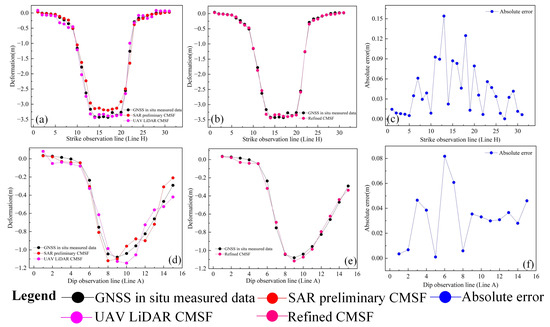(a,d) The deformation comparison of the SAR preliminary CMSF, UAV LiDAR CMSF, and GNSS in situ measured data in Line H and Line A, respectively. (b,e) The deformation comparison of the refined CMSF and GNSS in situ measured data in Line H and Line A, respectively. (c,f) The error between refined CMSF and GNSS in situ measured data in Line H and Line A, respectively.