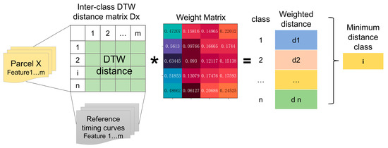 - Sample TWDTW distance calculation. Based on the j average timing curve of class i, the TWDTW distances, , between the j and all samples including class i are calculated by the following equation:where h is the total number of samples, which represents all TWDTW distances (mentioned in Section 3.3.1) between all classes on the j curve when the reference is class i. The more discrete is, the greater the distance between each class, which means greater divisibility. A wider means a smaller distance between classes and weaker differentiability.