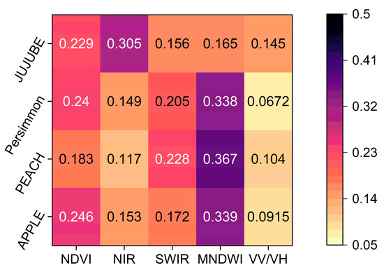 - The strengths of the entropy weight matrix In this experiment, we attempted to employ the entropy weight method to assign weights to multiple indices, aiming to enable the input of the TWDTW algorithm for multi-dimensional curves and enhance the accuracy of the results. As shown in Table 2, compared to the traditional single-band TWDTW method, the ETW-DTW method, which integrates multi-band information, demonstrates significant advantages. According to the principle of entropy weighting, the level of information entropy depends on the probability distribution of the data, making it highly robust to outliers. In contrast, the variance weighting method also assigns weights based on data dispersion but is highly sensitive to outliers and performs poorly when the indices have different scales or the data characteristics are not distinct. Using the same approach, we replaced the entropy weights with variance weights to obtain the classification accuracy for orchard classification. The overall accuracy (OA) was 0.627, the Kappa coefficient was 0.494, and the F1-score was 0.593, all of which are lower than the classification accuracy based on entropy weights. Overall, entropy weighting better reflects the relative information content of each index, reduces the impact of outliers and extreme values, and is more suitable for handling complex ecological analysis problems involving multiple indices, scales, and distributions.