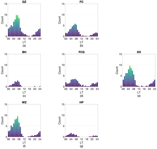 Six-year average frequency of sea fog occurrence per hour for observation stations: (a) QZ, (b) FC, (c) FCG, (d) DX, (e) BH, (f) WZ, and (g) HP.