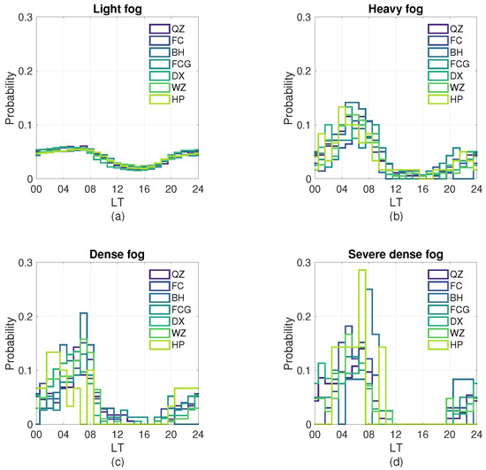 Hourly probability histograms of different fog categories at Beibu Gulf observation stations in terms of (a) Light Fog, (b) Heavy fog, (c) Dense fog, and (d) Severe dense fog.