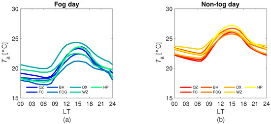 Six-year average diurnal variation in air temperature on (a) fog and (b) non-fog days at observation stations in the Beibu Gulf.