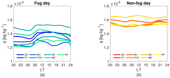 Six-year average diurnal variation in specific humidity on (a) fog and (b) non-fog days at observation stations in the Beibu Gulf.