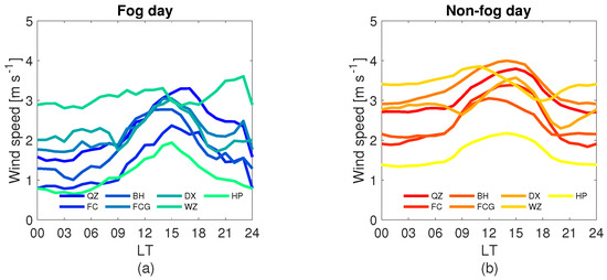 Six-year average diurnal variation in wind speeds on (a) fog and (b) non-fog days at observation stations in the Beibu Gulf.