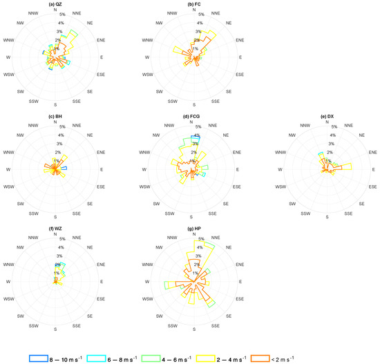 The intensity of the wind should be another factor that regulates the occurrence of sea fog in the Beibu Gulf. The lower wind speeds of the day also coincided with a higher frequency of sea fog occurrence, and vice versa (see Figure 6 and Figure 7). Figure 6 and Figure 7 compare the diurnal variations of horizontal wind speed and wind direction on foggy and non-fog days in the Beibu Gulf. It is evident that wind speeds during fog days are lower than those on non-fog days. This is attributed to the fact that low wind speeds in the lower atmosphere weaken convection and the horizontal movement of air, thereby preventing the efficient dispersion of water vapor, which subsequently accumulates water vapor and facilitates fog formation. Additionally, these low wind speeds stabilize the lower atmosphere and reduce turbulence in this region, further aiding in the maintenance of fog. This is evident in HP, which is characterized by lower wind speeds compared to the other six stations. Here, the reduced wind speed allows water vapor to accumulate more easily than at other observation stations. The excess water vapor then condenses to form fog, releasing latent heat that warms the atmosphere. This is in line with Figure 4a and Figure 5a. While other stations have higher wind speeds than HP, fog formation at these stations should not be explained solely by excess water vapor. Considering the lower temperatures compared to non-fog days (see Figure 4a), these stations should be more regularly influenced by decreases in temperature, either through the radiative cooling of moist air or the frontal lifting of warmer air.