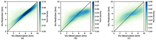 RF accurately predicted the observed visibility below 10 km, closely aligned with the line y = x. However, within the low visibility range (<4 km), RF appears to slightly overestimate (see Figure 8a). XGBoost and CatBoost show similar visibility predictions (see Figure 8b,c), with a similar distribution of those scatter points. In addition, RF and CatBoost do not perform well in predicting low visibility, (see Figure 8a,c). This limitation has also been identified in Kim et al. [38]. We assume that this is due to the extremely limited number of dense and severe dense fog samples, as the sample size can significantly impact model performance [47]. As a result, the RF and the other models cannot satisfactorily capture the feature of low-visibility samples due to dense or severe-dense fog. This eventually leads to unsatisfactory performance in predicting low visibility. Long-term observation of low visibility due to dense and severe-dense fog occurrence is required. In contrast, XGBoost effectively captures most low visibility ranges. Although XGBoost shows a smaller , it aligns well with observations within the lower visibility range of less than 4 km (see Figure 8b).