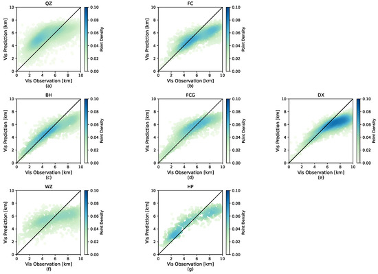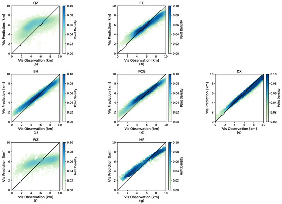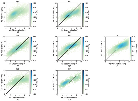 Performance of the general XGBoost model: predicted visibility vs. observed visibility for (a) QZ, (b) FC, (c) FCG, (d) DX, (e) BH, (f) WZ, and (g) HP.