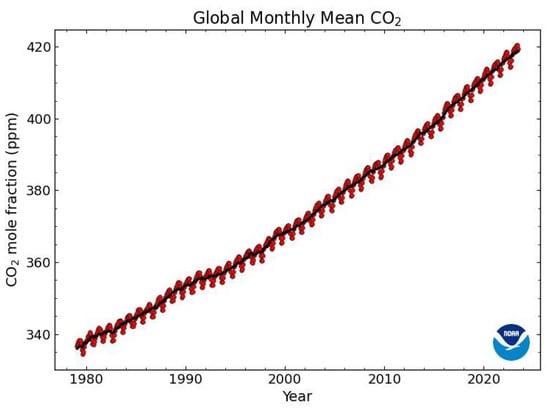 Monthly average of global CO2 concentrations (from https://gml.noaa.gov/ccgg/trends/global.html, accessed on 25 June 2023).