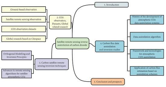 The structure of this paper is outlined in Figure 3. Section 1 introduces the research’s context, significance, and contributions. Section 2 reviews advancements in ground-based and satellite CO2 observations, the XCO2 dataset, and uses CiteSpace to analyze current research trends. Section 3 details various forward models and inversion algorithms for XCO2 remote sensing. Section 4 covers the development of the CO2-assimilation system, focusing on data-assimilation algorithms, frameworks, and carbon flux applications. Section 5 provides a summary of the paper.