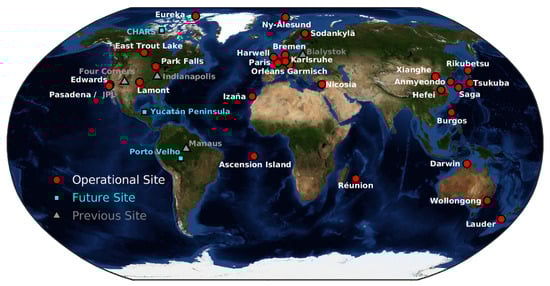 Distribution of stations of the Total Carbon Column Observation Network (from https://tccon-wiki.caltech.edu/Main/TCCONSites, accessed on 23 August 2023).