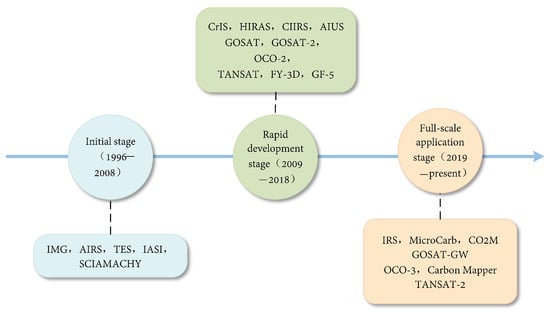 In this paper, the development of carbon-monitoring technology is divided into three stages in Figure 5 based on the degree of progress of satellite remote sensing technology and the demand for carbon-monitoring applications: the initial stage (1996–2008), the rapid development stage (2009–2018) and the full-scale application stage (2019–present).