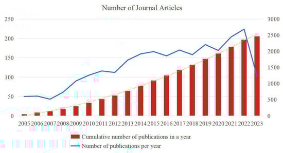 Figure 7 illustrates the annual number of publications on satellite remote sensing CO2 and inverse assimilation from 2005 to mid-2023. The blue line shows the yearly publication count, peaking in 2022, while the red bar graph represents the cumulative number of publications, indicating an upward trend. This figure highlights the increasing investment and attention in carbon remote sensing research.