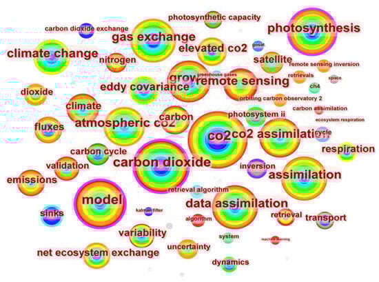 Figure 8 presents a keyword heat map based on approximately 2000 paper articles. The size of the circles corresponds to the frequency of keyword appearance, and the connecting lines indicate relationships between different keywords. Notably large circles for “atmospheric CO2”, “satellite remote sensing”, “inverse assimilation”, and “modeling” highlight their prominence. This indicates a strong link between CO2 inversion and satellite remote sensing. Additionally, recent trends include emerging technologies such as satellite inversion, machine learning, and data assimilation, reflecting current hot topics in carbon remote sensing.