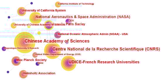 Figure 9 displays a map showing the number of publications on satellite-based carbon dioxide remote sensing by national institutions. In this map, larger circles represent higher publication frequencies and greater contributions. Nodes highlighted in red indicate areas of significant attention in the field. The graph reveals that prominent institutions and laboratories from the United States, China, the United Kingdom, and Germany have made substantial contributions to this research area.