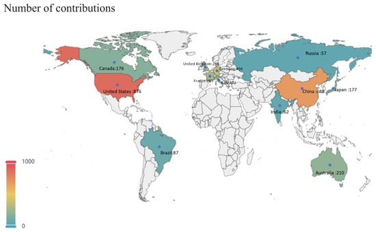 This paper employs the Pycharts module in Python to create a flat world map illustrating contributions from different countries to carbon remote sensing research. Figure 10 uses various colors to represent the level of contributions, with grey indicating no contributions from certain regions among around 2000 papers. The map shows that the United States, China, the United Kingdom, and Germany are leading in this field. Other countries are emerging, and increased attention and investment in carbon neutrality are expected to accelerate global progress.