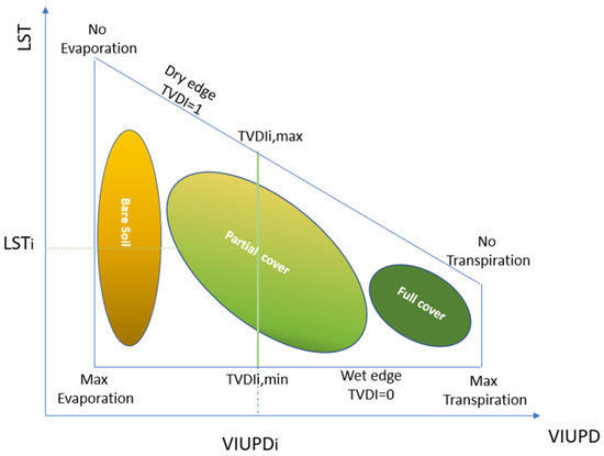 Where TVDIijk represents the monthly TVDI value for a specific pixel (i) in month (j) of year (k), LSTijk denotes the LST value for the same pixel (i) during the same month (j) of the same year (k), and LSTi,min(VIUPD)LST_{i,min(VIUPD)}LSTi,min(VIUPD) and LSTi,min(VIUPD) and LSTi,max(VIUPD) are the multi-year minimum and maximum LST values for pixel (i) with respect to VIUPD.