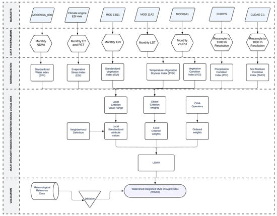 The methodology illustrated in Figure 3 outlines a comprehensive process for developing the WIMDI to provide a reliable multi-drought index for watershed-level management. The procedure begins with the acquisition and preparation of various datasets, covering the period from 2002 to 2022, including MOD09GA_006 for monthly NDWI, Climate Engine ESI for monthly ET and PET, MOD13Q1 for monthly EVI, MOD11A2 for monthly LST, MOD09A1 for monthly VIUPD, CHIRPS for precipitation data resampled to a 1000 m resolution, and GLDAS-2.1 for soil moisture data, also resampled to a 1000 m resolution.