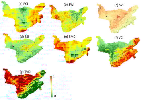 where ) and ) represent the maximum and minimum values of the kth drought index within the th neighborhood.