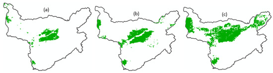 We chose the EVI index instead of the NDVI because of its less sensitivity to soil background and uses the blue wavelength to correct for soil and atmospheric disturbances, making it more reliable than NDVI under these conditions. EVI is demonstrated in Equation (5) as follows: