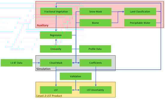 Two separate data records are publicly available for SLSTR: the operational near-real-time/non-time-critical (NRT/NTC) product (SL_2_LST) for SLSTR-A and SLSTR-B; and the climate product (LST_cci), which is available with a latency of several months. These products are freely available from Copernicus, in the case of SL_2_LST, and from ESA, in the case of LST_cci, in easily accessible NetCDF format. They offer near-complete global coverage each day at 1 km spatial resolution. Long-term operational continuity of the Sentinels through the Copernicus Programme is assured with the next generation of missions already in the early development phases. While the SLSTRs have at present a short data history, they are successor missions to the ATSR series enabling long-term multi-mission data records to be created. An advantage of the LST_cci products is that they provide climate quality data, where the whole mission is processed consistently to eliminate non-climatic trends or step changes. One advantage of the SL_2_LST products is that they provide data in near-real time, but they compromise on quality compared to the LST_cci products. Optimal auxiliary datasets are not available within the NRT/NTC timeframe for the SL_2_LST products. Furthermore, there is inertia in the operational system when instituting changes to the algorithm, and, indeed, some operational users may prefer for changes not to be made. This paper presents a comparison of these SLSTR products, which is crucial for users of LST data to understand the advantages and disadvantages of these products. An overview of the methods and processes for generating the SLSTR Level-2 LST products is illustrated in Figure 1, with detailed descriptions of the individual steps presented in the sections below.