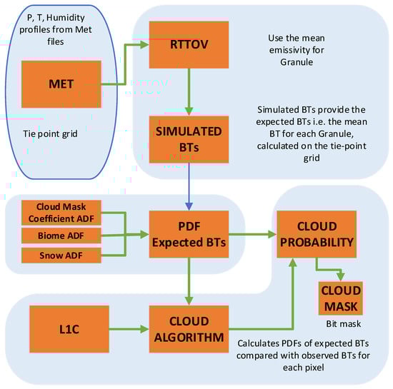 Flow diagram representing the different steps in formulating the probabilistic cloud mask for SLSTR.
