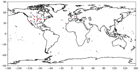 Data are acquired from eleven in situ stations, which are installed with well-calibrated instrumentation, which have been used routinely throughout the lifetime of the Sentinel-3s for operational validation. These come from four different networks: (i) Surface Radiation Budget (SURFRAD)—Bondville, Illinois; Desert Rock, Nevada; Fort Peck, Montana; Goodwin Creek, Mississippi; Penn State University, Pennsylvania; Sioux Fall, South Dakota; Table Mountain, Colorado); (ii) Atmospheric Radiation Measurement (ARM)—Southern Great Plains, Oklahoma; Barrow, Alaska); (iii) U.S. Climate Reference Network (USCRN) Des Moines, Iowa; Manhattan, Kansas; and (iv) Copernicus Space Component Validation for Land Surface Temperature, Aerosol Optical Depth and Water Vapor Sentinel-3 Products (LAW)—KIT Forest, Germany (Table 4, Figure 6). The choice of these specific stations is based primarily on their length of record. There a few global validation sites that are suitable for LST validation and some of these have relatively short data records. By selecting stations with longer data records, which have an established use in LST validation, we were able to quality check the in situ data using the knowledge of the long data record so as to better identify any non-climatic drift or step changes. Lake sites were not considered since LST_cci does not produce data over any waterbodies.