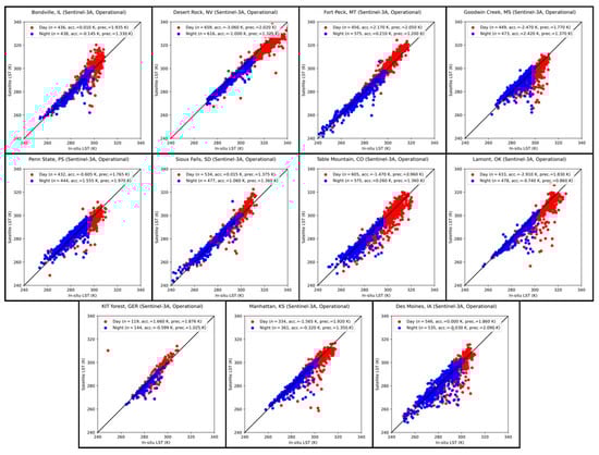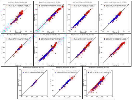 Daytime (red) and night-time (blue) in situ validation matchups for the SL_2_LST product for SLSTR-A from 2018 to 2021 inclusive with respect to eleven in situ sites: Bondville, Illinois (first row, first column); Desert Rock, Nevada (first row, second column); Fort Peck, Montana (first row, third column); Goodwin Creek, Mississippi (first row, fourth column); Penn State, Pennsylvania (second row, first column); Sioux Falls, South Dakota (second row, second column); Table Mountain, Colorado (second row, third column); Southern Great Plains, Oklahoma (second row, fourth column); KIT Forest, Germany (third row, left column); Manhattan, Kansas (third row, centre column); and Des Moines, Iowa (third row, right column).