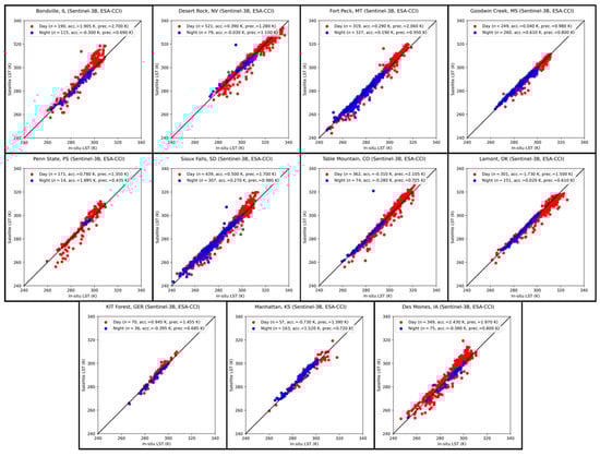 Daytime (red) and night-time (blue) in situ validation matchups for the SL_2_LST product for SLSTR-B from 2018 to 2021 inclusive with respect to eleven in situ sites: Bondville, Illinois (first row, first column); Desert Rock, Nevada (first row, second column); Fort Peck, Montana (first row, third column); Goodwin Creek, Mississippi (first row, fourth column); Penn State, Pennsylvania (second row, first column); Sioux Falls, South Dakota (second row, second column); Table Mountain, Colorado (second row, third column); Southern Great Plains, Oklahoma (second row, fourth column); KIT Forest, Germany (third row, left column); Manhattan, Kansas (third row, centre column); and Des Moines, Iowa (third row, right column).