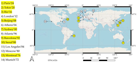 Location of the Olympic Game cities from 1972 to 2024, which are included in the Google Earth Engine code. The cities used as examples in this paper, representing four Olympic urban planning patterns, are highlighted in yellow. Source: Author’s own elaboration based on data from Open Street Map (@OpenStreetMap contributors) and International Olympic Committee (IOC) information [59].