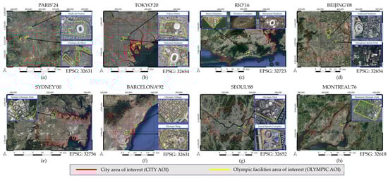 Area of interest (city AOI) of the eight cities analysed (red outline), and its corresponding area of interest (Olympic AOI) of the Olympic facilities (yellow outline). (a) In the Paris case, the city AOI is defined by the Ille de France administrative boundaries. (b) In the Tokyo case, the city AOI is defined by some municipalities of the Tokyo Metropolitan Area administrative boundaries. (c) In the Rio case, the city AOI is defined by the Rio de Janeiro Municipality administrative boundaries. (d) In the Beijing case, the city AOI is defined by Beijing’s central urban area. (e) In the Sydney case, the city AOI is defined by some municipalities of the North South Wales administrative boundaries. (f) In the Barcelona case, the city AOI is defined by the administrative boundaries of Barcelonès. (g) In the Seoul case, the city AOI is defined by Keijo Teukbyeolsi administrative boundaries. (h) In the Montreal case, the city AOI is defined by the Champlain, Communauté Urbaine de Montréal and Laval administrative boundaries.