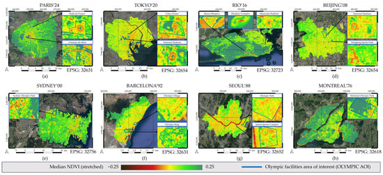 - Montreal (Olympic city in 1976): Montreal is the second-most populous city of Canada and the capital of the province of Quebec. With a population of 1,762,949 inhabitants in 2021, its metropolitan urban area is home to 4,291,732 people [69]. The administrative limits of the Champlain, Communauté Urbaine de Montréal and Laval municipalities were used for the delimitation of the Montreal urban AOI area, covering 894 km2.The Olympic facilities AOI polygon was manually digitized based on the official venue [59], with a focus on the Montreal Olympic Park facilities, including among others the Olympic Stadium, the Olympic Velodrome, the Olympic Pool, the Botanical Garden and the Olympic village, with an overall area of 2 km2. The Olympic urban planning can be categorized as monocentric [3] (Figure 2h).