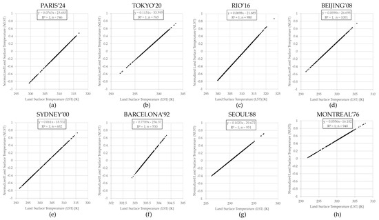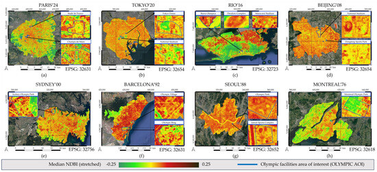 The equatorial crossing time (ECT) of the Landsat Series satellites is between 09:45 and 10:00 local solar time, that is, in the daytime phase over the area of interest. Given the worldwide geographical location of the AOI, images from different WRS-2 tiles have been used. Additionally, given the variability in the cloud cover over each city, a different number of images has been used. Moreover, in the GEE processing we applied cloud masking (see Section 2.3). Furthermore, for each city, looking for the representativity of the urban plan effects, we selected images from the 1st day of the Olympic year to 4 years later (e.g., from 1 January 1992 to 31 December 1995, in the case of Barcelona). As exceptions, there is Paris 2024 (with start date on 1 January 2023), London (where we used the launch date of Landsat-8 as the initial date) and cities before the launch of Landsat-4 (in these cases, we used the launch date of Landsat-4 as the initial date).
