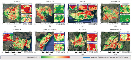 The main tools for the direct measurement of the urban temperature are evidently based on thermal sensors, either in terrestrial meteorological stations for measuring air temperature, or sensors on board aircraft or satellites for measuring LST. Developed territories usually have networks of meteorological stations equipped with thermometers [43,44], from which spatially specific data are obtained. The advantages of field observations are their proximity to the Earth’s surface and the temporal resolution of the data (e.g., hourly records), but the disadvantage is that they are punctual observations and so, from a geographical point of view, are often far from the location of interest. On the other hand, since the beginning of satellite remote sensing for meteorological purposes in the 1970s (e.g., Meteosat), the thermal data of the LST measured from space have been available [45]. The main advantages of satellite observations are the systematic sampling of a territory (global coverage) and the periodicity of measurements. It should be noted that one of the main drawbacks of meteorological satellite remote sensing, with respect to stations on the ground, is the need to apply atmospheric corrections and consider the presence of clouds that can hinder measurements. Despite their drawbacks, satellite remote sensing techniques with thermal sensors have been crucial in the study and monitoring of temperatures from the applied perspective of large agencies [46]. Given the availability of thermal data from satellite missions such as MODIS (already completed) and Landsat (active since the 1970s), images derived from these data have become the material and methodological basis of many studies on the spatial behaviour of temperatures at a scientific level [47,48,49,50], with a special utility in places with a low density of terrestrial meteorological stations [51,52]. Particularly interesting, due to their characteristics, are the thermal images from the Landsat series of satellites [53], which, due to the orbit that the satellite follows, are obtained every 16 days and have a spatial resolution of 120 m to 60 m (depending on the sensor). The thermal band spatial resolution can be improved to 30 m with image processing techniques, based on the NDVI obtained from red and infrared higher resolution bands, similarly to the pan-sharpening method using the panchromatic band in Landsat-7, Landsat-8 and Landsat-9 [39,54,55]. With these, it is possible to obtain a systematic sampling of the LST continued over time and on a sufficiently detailed scale to analyse the urban surface temperatures, as has been carried out in numerous previous studies throughout the world [56,57,58]. Heat maps from satellites can be used to monitor LST, while optical data collected by satellites can report where and when land use and land cover have changed over time. Once land covers and surface temperatures have been mapped, incorporating socioeconomic data related to population, demographics, and health information into heat vulnerability indices can help guide interventions to manage risks for public health related to heat, as well as the comfort of users of the Olympic venues in this specific case.