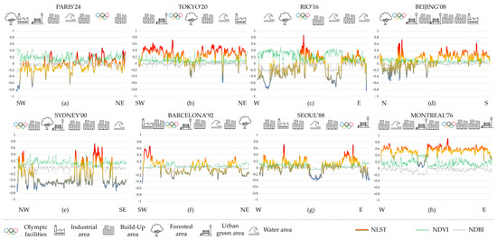 Thermal transect: A segment was digitized to obtain the thermal profile from the NLST, crossing the city and the Olympic facilities. Additionally, the NDVI and NDBI profiles were included for comparison. The Profile Tool v.4.2.6 plugin for QGIS [88] was utilized to intersect the segment with the target raster and extract the value of overlapping pixels. The resulting table of values can be plotted in GIS software or exported to another program, such as MS Excel, for graph editing.
