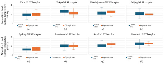 Boxplot of the NLST: We conducted a comprehensive analysis using the NLST raster values for each city AOI and Olympic facilities AOI. We employed a boxplot to visually represent the distribution of these values, which enabled us to estimate the prevalence of urban planning associated with Olympic facilities. The boxplot statistics were derived from the raster pixel values within the respective AOIs, and we excluded any outliers from the visualization.