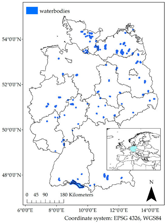 Investigated waterbodies (dark blue) in Germany within the federal states. Coordinate system EPSG 4326, WGS84. Inset map: situation of Germany within Europe.