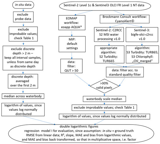 The workflows based on the products derived by eoapp AQUA and CyanoAlert and for the in situ data are shown in Figure 2. Chlorophyll values derived from the remote sensing data were interpreted as chlorophyll-a.