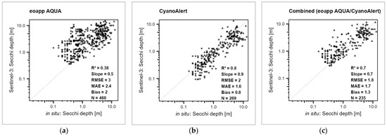 Regression between in situ (x axis) and Sentinel-3 OLCI remote sensing Secchi depth values (y axis) from the waterbody-scale evaluation, values from the same day, on a logarithmic scale, dots transparent black. (a) eoapp AQUA processing chain, (b) CyanoAlert processing chain, and (c) combined approach. R2 = determination measure, Slope = regression line slope, MAE = mean average error, Bias = mean bias; all four based on log transformed data, RMSE = root mean square error, N = number of measurements. For the results for Sentinel-2, refer to Supplementary Information SI5.