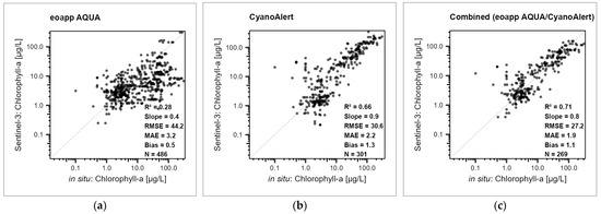 Regression between in situ (x axis) and Sentinel-3 OLCI remote sensing chlorophyll-a values (y axis) from the waterbody-scale evaluation, values from the same day, on a logarithmic scale, dots transparent black. (a) eoapp AQUA processing chain, (b) CyanoAlert processing chain, and (c) combined approach. R2 = determination measure, Slope = regression line slope, MAE = mean average error, Bias = mean bias; all four based on log transformed data, RMSE = root mean square error, N = number of measurements. For the results for Sentinel-2, refer to Supplementary Information SI5.