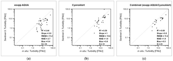Regression between in situ (x axis) and Sentinel-3 OLCI remote sensing turbidity values (y axis) from the waterbody-scale evaluation, values from the same day, on a logarithmic scale, dots transparent black. (a) eoapp AQUA processing chain, (b) CyanoAlert processing chain, and (c) combined approach. R2 = determination measure, Slope = regression line slope, MAE = mean average error, Bias = mean bias; all four based on log transformed data, RMSE = root mean square error, N = number of measurements. For the results for Sentinel-2, refer to Supplementary Information SI5.