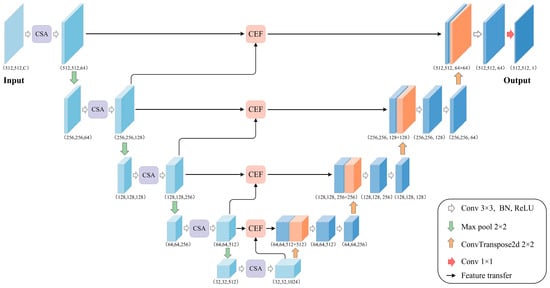 CEFCSAU-net network model architecture. The input size was (512, 512, C), where C denotes the number of channels, and experiments in this paper utilized either 3 or 4; during the model’s operation on a GPU, intermediate feature maps were stored as tensors.