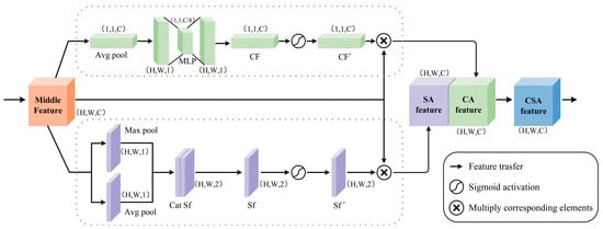 Attention mechanism module for channel and space mixing. Here, (H, W, C) represent the height, width, and number of channels of the feature data, respectively, with values determined by input features at different stages. CF and CF’ denote feature maps from various intermediate operations within the channel attention mechanism. Cat Sf, Sf, Sf’ represent feature maps from different intermediate operations of the spatial attention mechanism. The SA feature denotes the feature map post-spatial attention mechanism, the CA feature represents those post-channel attention mechanisms, and the CSA feature illustrates feature maps following the CSA module.