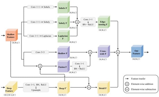 Cross-scale edge-aware feature fusion module. Sobelx F, Sobely F, and Laplacian F denote feature maps resulting from various edge detection operations. Shallow F refers to feature maps following shallow feature convolution. Fusion F illustrates feature maps resulting from the fusion of shallow and deep features. Deep F’ represents feature maps after a series of operations on deep features.