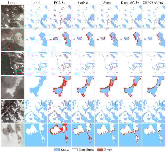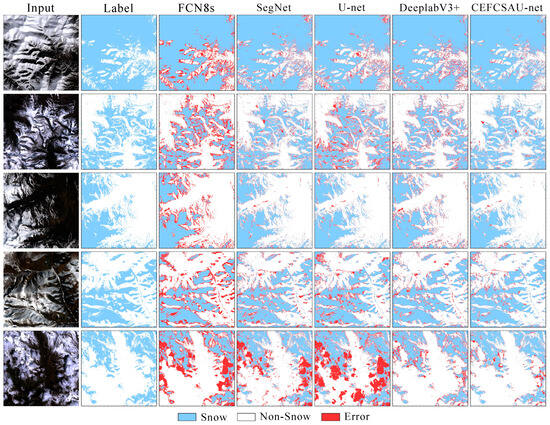 Additionally, in traditional snow detection methods, the SWIR band of the NDSI plays a crucial role []. Consequently, this study specifically incorporated the SWIR band in analyzing Landsat data to assess its impact on the performance of deep learning models. The experimental results are shown in Table 3. Comparison with Table 2 reveals that the overall performance of the SegNet and CEFCSAU-net models has improved, particularly the CEFCSAU-net model, which exhibited exceptional performance. However, some metrics of other models demonstrated a decline in performance, possibly due to the minimal differences in snow across visible light bands (such as blue, green, red), which led to certain limitations in model performance due to information redundancy. These results indicate that the CEFCSAU-net model exhibits consistent performance; however, further research is needed to explore how multispectral data fusion could potentially enhance remote sensing image processing algorithms.