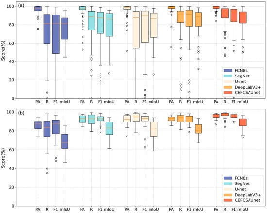 From the experimental results of the previous CEFCSAU-net model on CSWV_S6 data and Landsat8 OLI data, the indicators of PA, R, F1, and mIoU are higher than other models. Furthermore, the results of the ablation experiments confirm that the incremental integration of the CSA and CEF modules into the U-net model effectively enhances its performance. Meanwhile, by comparing the boxplots of various indicators of different models on the two sets of data in Figure 8, it can be found that the indicator scores of the CEFCSAU-net model for the whole test set of data are stable, compact, and uniformly distributed compared with the other four models. This further confirms the significant role of the improvement measures discussed in this paper in enhancing model performance.