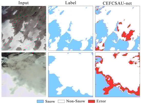As is well known, distinguishing between snow, clouds, and cloud shadows is a crucial step in remote sensing processing []. Yao et al. [] introduced the CD-AttDLV3+ network, which employs channel attention and demonstrates outstanding performance in distinguishing clouds from bright surfaces and detecting translucent thin clouds, providing valuable insights. In Section 3.1 and Section 3.2, Figure 6 and Figure 7 illustrate that the CEFCSAU-net model has fewer error detection regions than the other models, both on the edges and in the details. However, the CEFCSAU-net model, while generally stable, shows an increased red error detection region in scenes with high cloud coverage, as seen in the fifth row of Figure 7. Analysis of the input image reveals that this error region primarily originates from the overlap of clouds and snow.