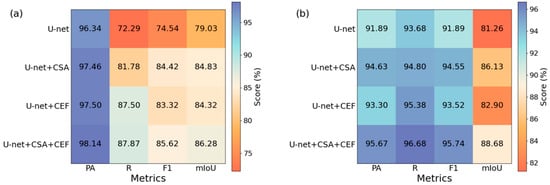 Heat map comparing the mean values of ablation experiments on the test set with different data sets: (a) CSWV_6 dataset, (b) Landsat8 OLI dataset.