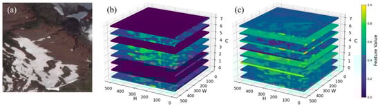 The CSWV dataset [] is a freely and publicly available dataset constructed by Zhang et al., based on synthesizing WorldView2’s red, green, and blue bands. The dataset was taken in the Cordillera Mountains of North America, and the distribution of clouds and snow was obtained based on the interpretation of WorldView2 images from June 2014 to July 2016. This study utilizes the CSWV_S6 data with a spatial resolution of 0.5 m (Figure 1), available at https://github.com/zhanggb1997/CSDNet-CSWV (accessed on 14 September 2024). The area depicted in the image comprises forests, grasslands, lakes, and bare ground, among others. In the dataset, clouds and snow were labeled, but only the snow labels were used in this study to classify features into snow and non-snow categories.