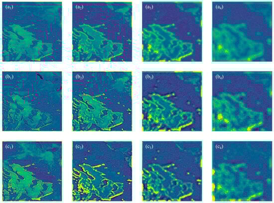 This figure displays average feature maps following skip connections at various stages under different configurations of the CEFCSAU-net model. In this figure, (a1–a4) represent the model configuration without both the CSA and CEF modules; (b1–b4) indicate configurations without the CSA module yet including the CEF module; and (c1–c4) depict configurations featuring both CSA and CEF modules. The dimensions of the four columns of feature maps are sequentially 512 × 512, 256 × 256, 128 × 128, and 64 × 64.